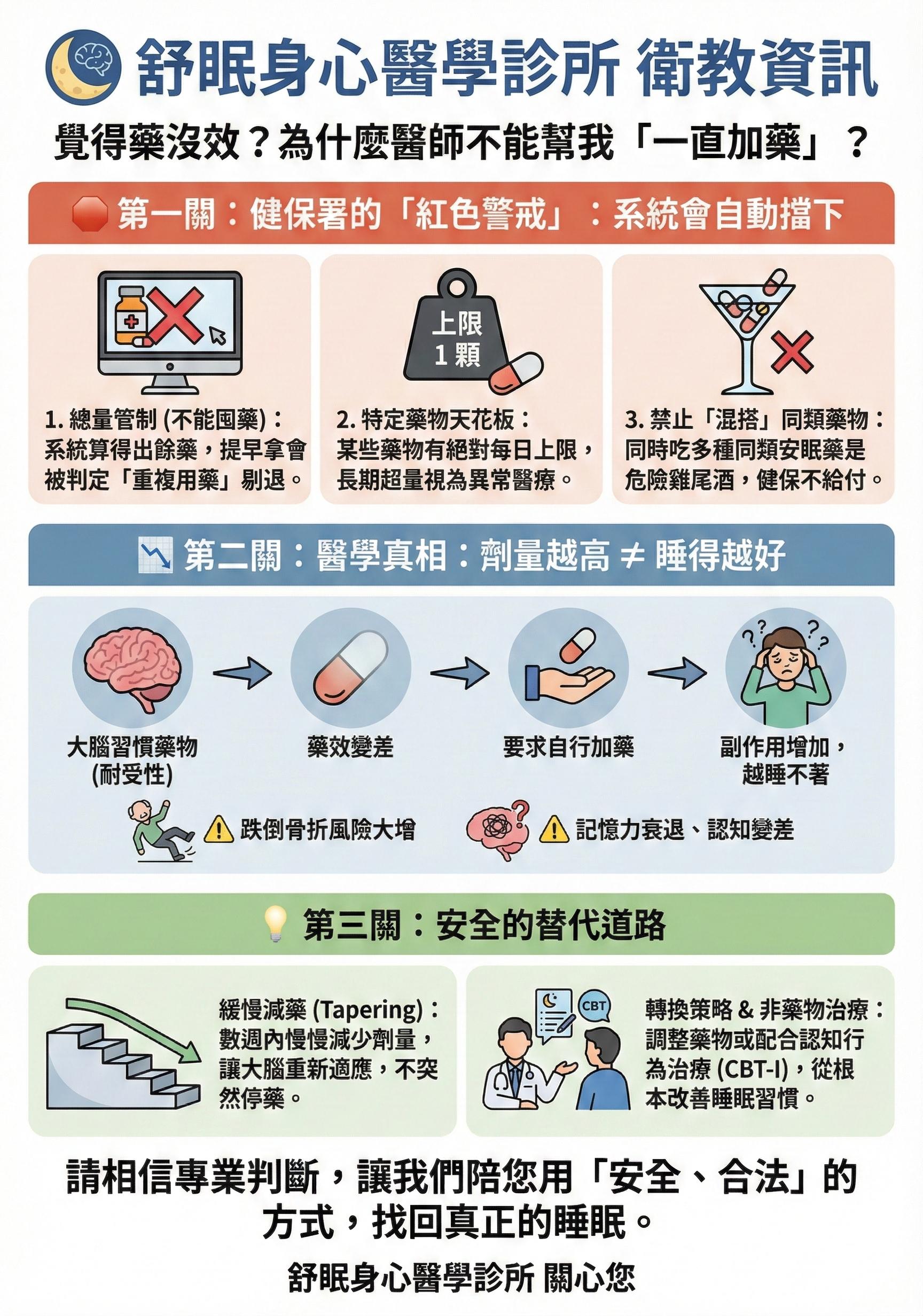 如果我們只依靠藥物,卻沒有去處理導致失眠的根本原因(如生活壓力、作息混亂),大腦神經對藥物的敏感度就會逐漸降低,這在醫學上稱為「耐受性」。這時候如果只是盲目地一直加藥,不僅會增加大腦神經系統的負擔,健保署對安眠藥的開立劑量也有著非常嚴格的規範,目的是為了保護病患的安全。