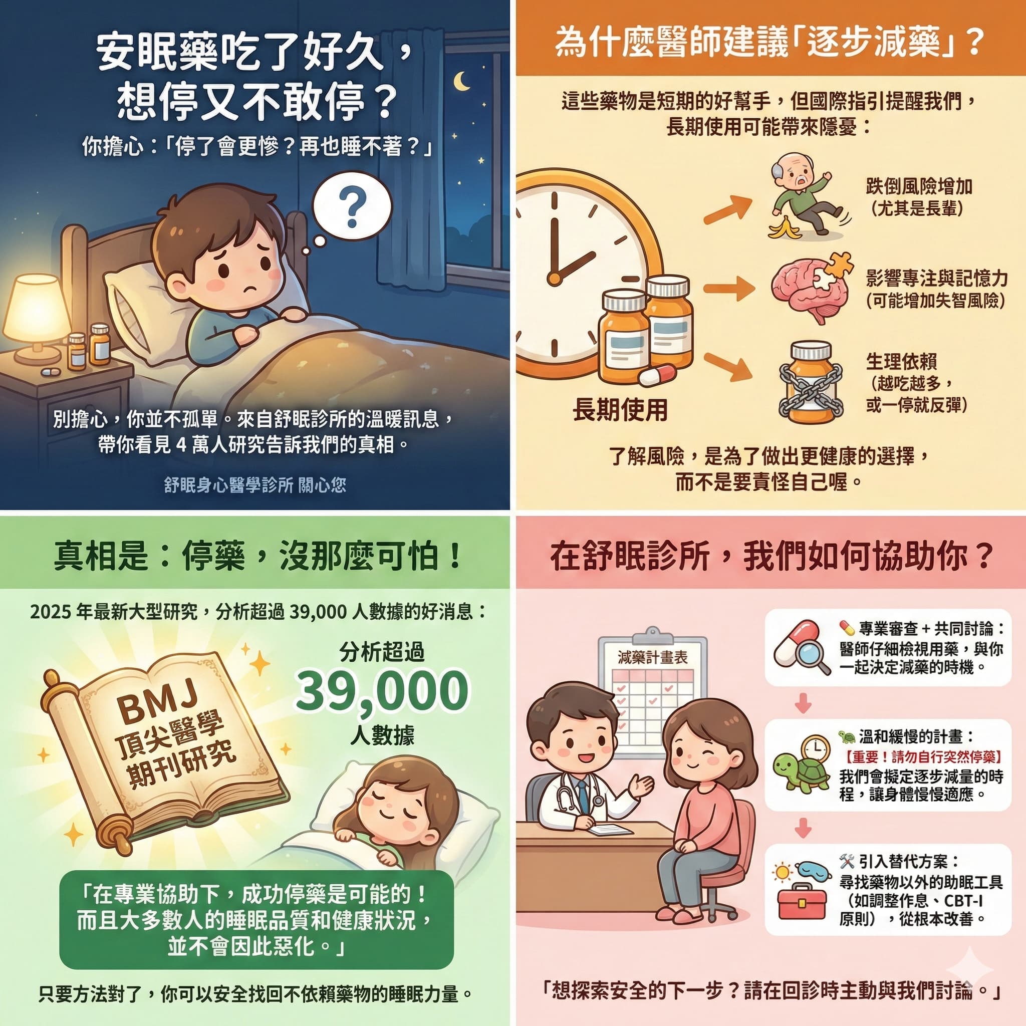 🩺 洪醫師的真心話: 「安眠藥不是洪水猛獸,但也不是萬靈丹。它就像腿斷掉時需要的拐杖,目的是幫助您度過最難熬的急性期。在『舒眠』診所,我們不給死板的教條,而是教您學會觀察自己的身體,聰明地使用藥物,並在狀況好轉時,有策略地慢慢丟掉拐杖。」